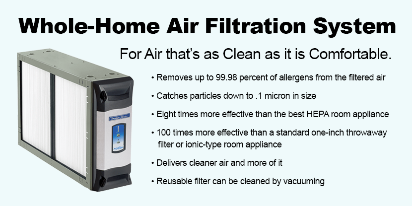 AccuClean Whole-Home Air Cleaner - A system that works smarter. The AccuClean Whole-Home Air Cleaner provides superior filtration of allergens in your home, reduces germs and viruses, and is certified asthma & allergy friendly by the Asthma & Allergy Foundation of America. Highlights include: Removes up to 99.8% of allergens from the filtered air, catches particles down to 0.3 micron in size, eight times more effective than the best HEPA room appliance, 100 times more effective than a standard one-inch throwaway filter or ionic-type room appliance.