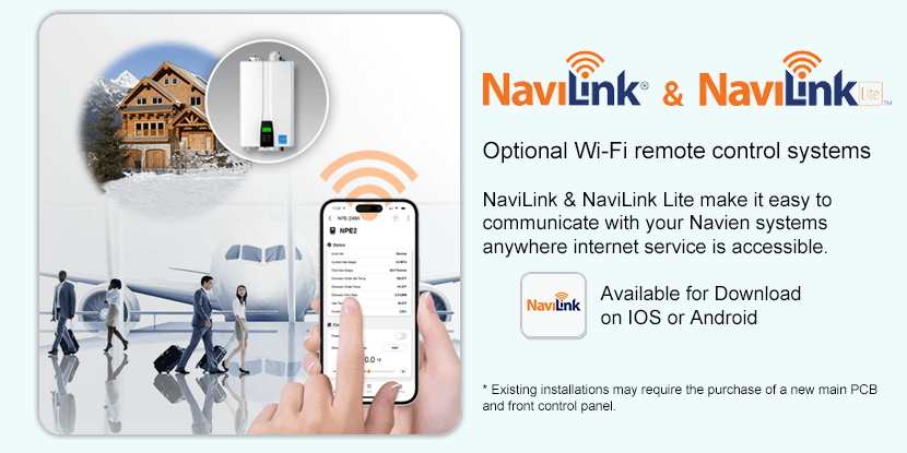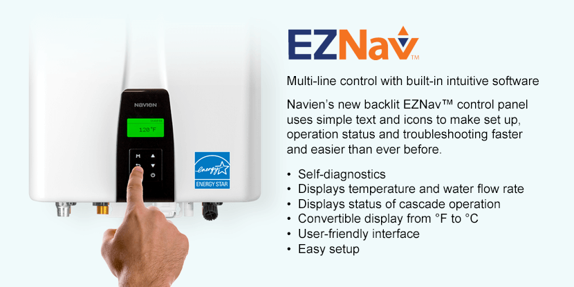 Navien’s new backlit EZNav™ control panel uses simple text and icons to make set up, operation status and troubleshooting faster and easier than ever before.