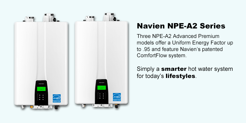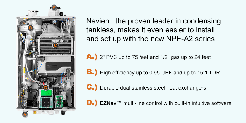 Navien...the proven leader in condensing tankless, makes it even easier to install and set up with the new NPE-A2 series.